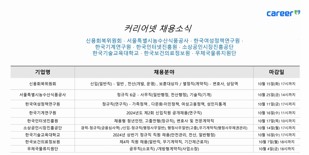 [피앤피뉴스=마성배 기자] 취업 포털 커리어는 4일 신용회복위원회, 서울특별시농수산식품공사, 한국여성정책연구원, 한국기계연구원, 한국인터넷진흥원, 소상공인시장진흥공단, 한국기술교육대학교, 한국보건의료정보원, 우체국물류지원단 등 다양한 공공기관의 채용 소식을 전했다. 각 기관이 다양한 직무와 분야의 인재를 모집하면서 취업 준비생들의 관심을 모으고 있다.