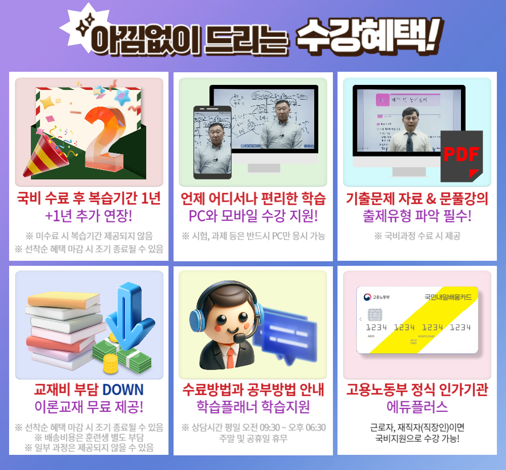 지금 신청하면 학습교재, 학습플래너 맞춤학습 지원, 국비과정 수료 시 추가혜택이 제공되어 효율적인 학습에 큰 도움이 된다. 자세한 내용은 에듀플러스원격평생교육원 홈페이지를 통해 확인 가능하다.