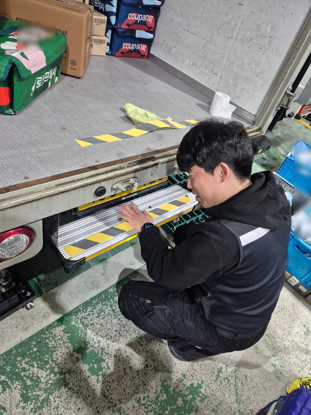 ▲안전사고 예방을 위해 배송 탑차 발판에 미끄럼 방지 패드를 직접 부착하고 있다./사진=㈜투네스트 제공