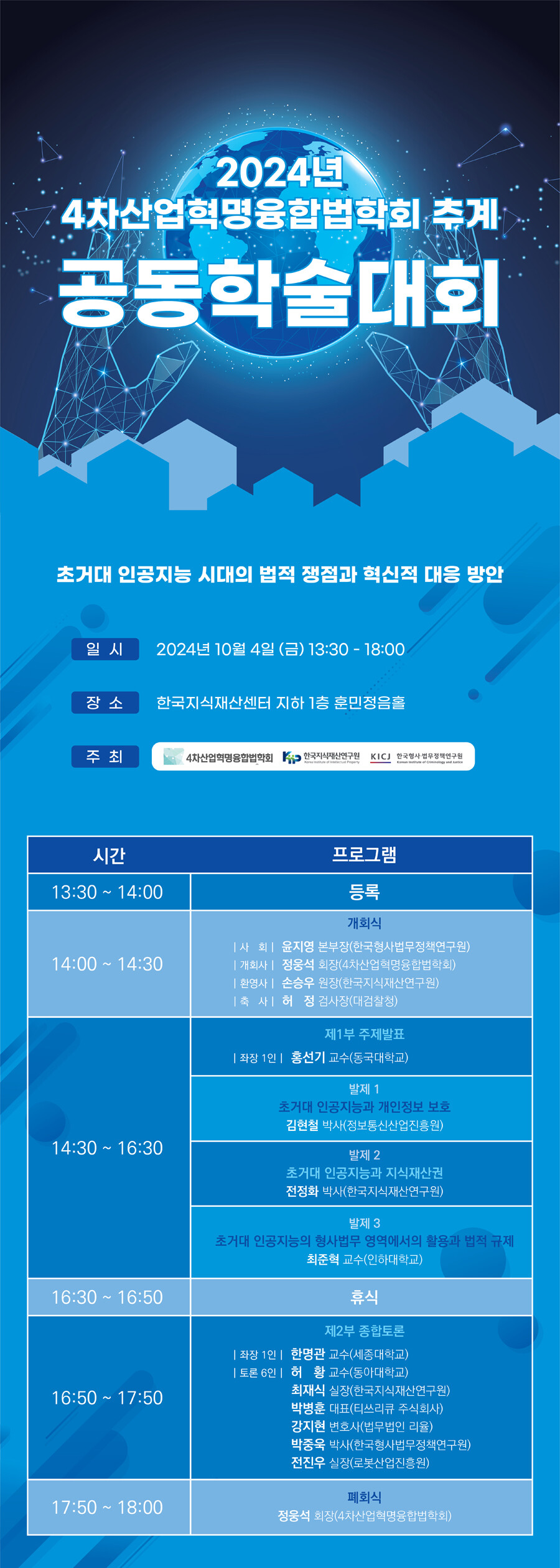 대검찰청 허정 검사장의 축사로 시작하는 이 행사는 학계와 산업계 전문가들이 초거대 인공지능이 불러올 패러다임 변화와 관련 쟁점에 대한 연구 결과를 공유하는 자리다. 개인정보 보호, 지식재산권, 공정 시스템 구축 등을 주제로 한 발표와 토론이 예정되어 있다.
