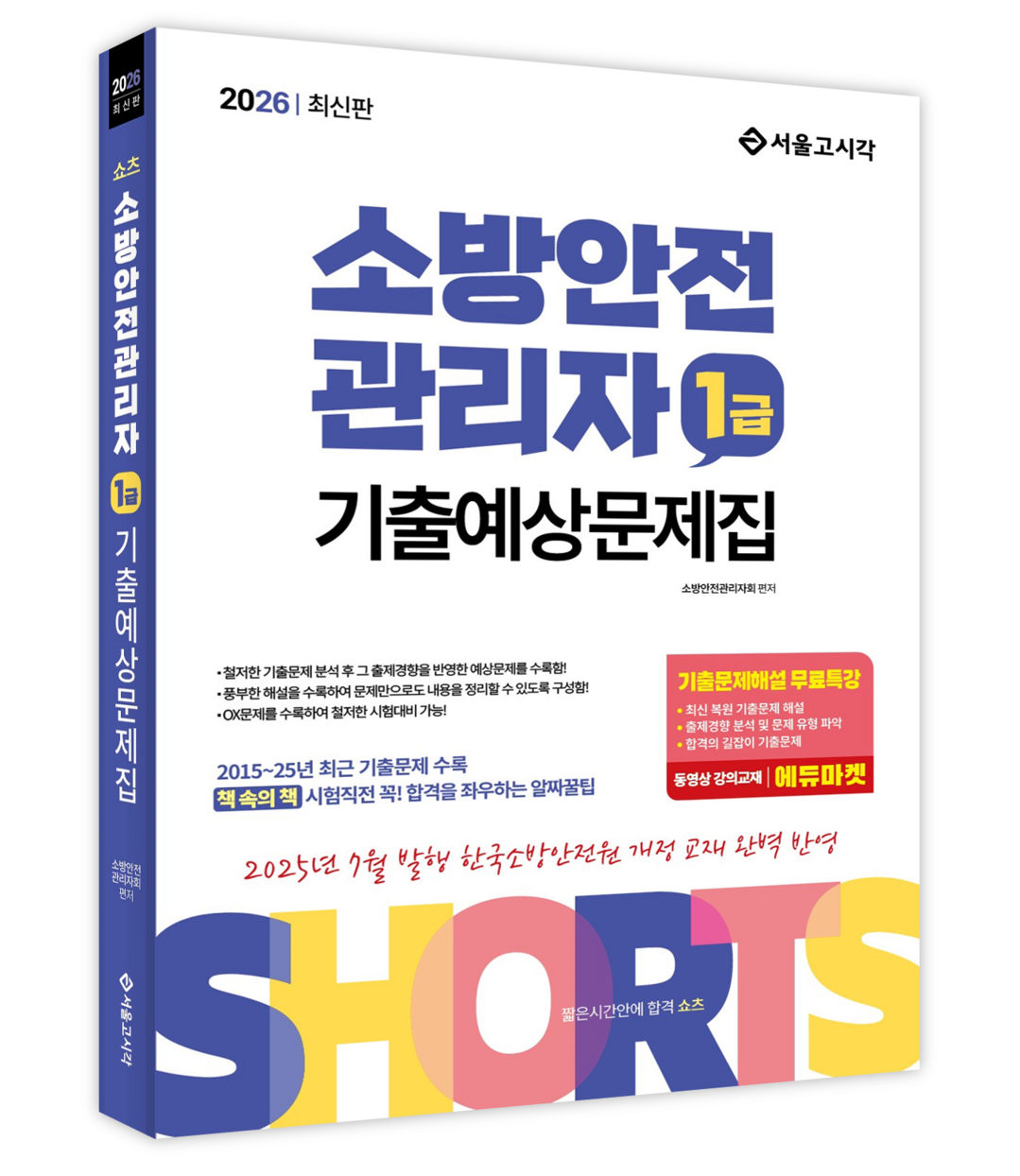이와 관련해 수험서 전문 출판사 서울고시각은 소방안전관리자 1급 시험 대비용 교재 ‘2026 쇼츠 소방안전관리자 1급 기출예상문제집’을 출간했다. 이번 교재는 최근 개정된 법령과 한국소방안전원 교재(2025년 7월 발행)에 맞춰 전면 개정됐으며, 대폭 늘어난 시험과목을 반영해 새로운 문제를 다수 수록했다.