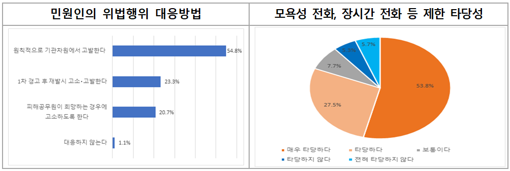 또한, 위법행위 대응방법으로는 ‘고소·고발 등 법적 대응’(98.9%)이 필요하다는 의견이 압도적으로 많았으며, 모욕성 전화, 정당한 사유 없는 반복민원, 과도한 자료요구 등 업무방해 행위는 ‘제한’(81.4%)이 필요하다고 응답해 법적대응, 업무방해행위 제한 방안 마련이 필요한 것으로 확인됐다.