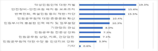 공무원 보호 방안으로는 악성민원인 처벌과 반복 전화, 욕설 민원의 제한, 차단 및 안전장비, 안전요원 배치 등의 보호조치 강화가 필요하다는 응답이 50.4%로 가장 많았다. 민원부서에 충분한 인력 배치 및 업무 분담, 기관장의 관심, 민원공무원의 전문성 강화 등도 중요하다는 응답이 25.7%에 달했다.