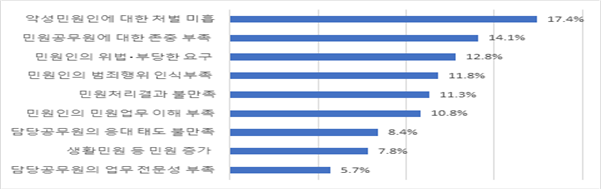 민원처리 결과에 대한 불만족(11.3%)과 공무원의 전문성 부족(5.7%)도 원인으로 꼽혀, 민원처리 역량 강화의 필요성이 제기되었다.