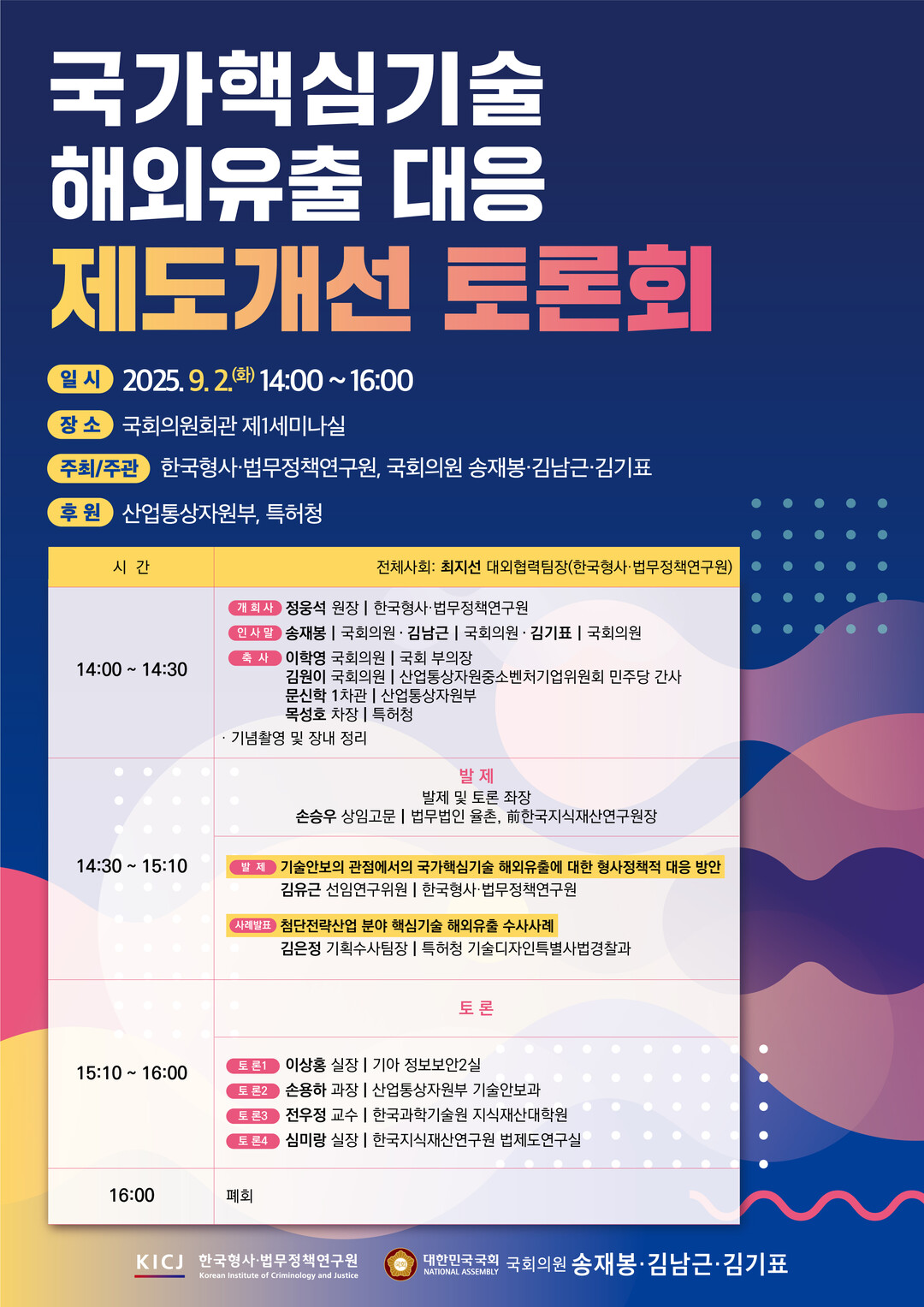[피앤피뉴스=마성배 기자] 한국형사·법무정책연구원(원장 정웅석)이 오는 9월 2일 오후 2시 국회의원회관 제1세미나실에서 「국가핵심기술 해외유출 대응 제도개선 토론회」를 개최한다. 이번 행사는 송재봉·김남근·김기표 국회의원과 공동 주최로 열리며, 국가 산업경쟁력의 근간이 되는 핵심기술 보호와 기술안보 관점에서의 실효성 있는 대응책을 모색한다.