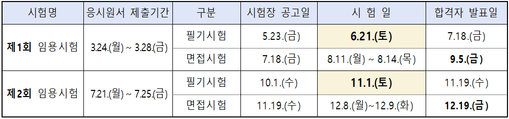 제1회 상반기 시험은 3월 24일부터 28일까지 원서접수를 진행한 후, 6월 21일 필기시험이 치러진다. 필기시험 합격자는 7월 18일 발표되며, 8월 11일부터 14일까지 면접을 거쳐 9월 5일 최종합격자가 확정된다.