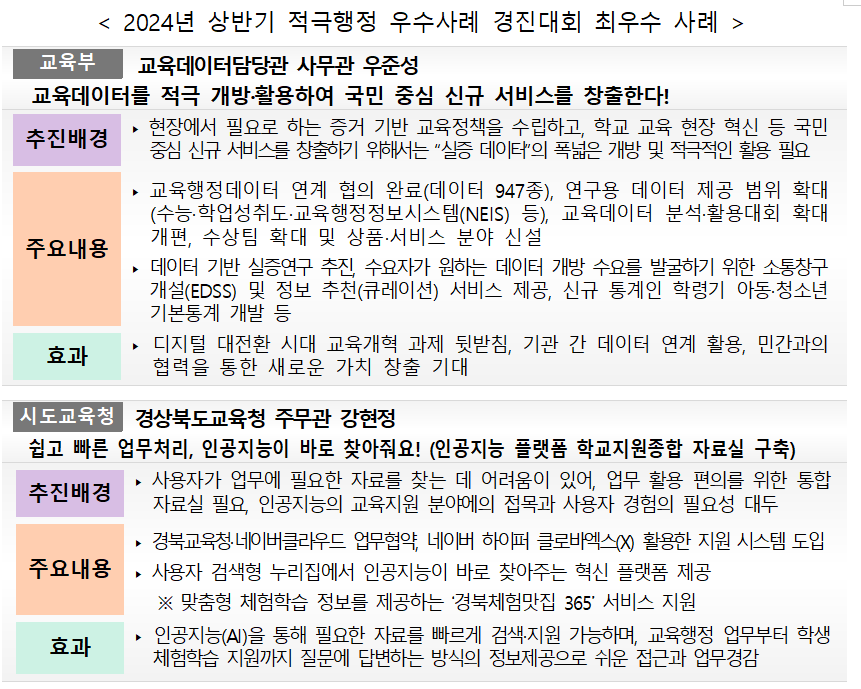 최종 순위는 교육부 규제심의 및 적극행정위원회에서 최종 사례 발표 평가를 거쳐 결정되었다. 수상 내역은 교육부 및 시도교육청 각각 최우수 1건, 우수 4건, 장려 5건으로 구성된다.