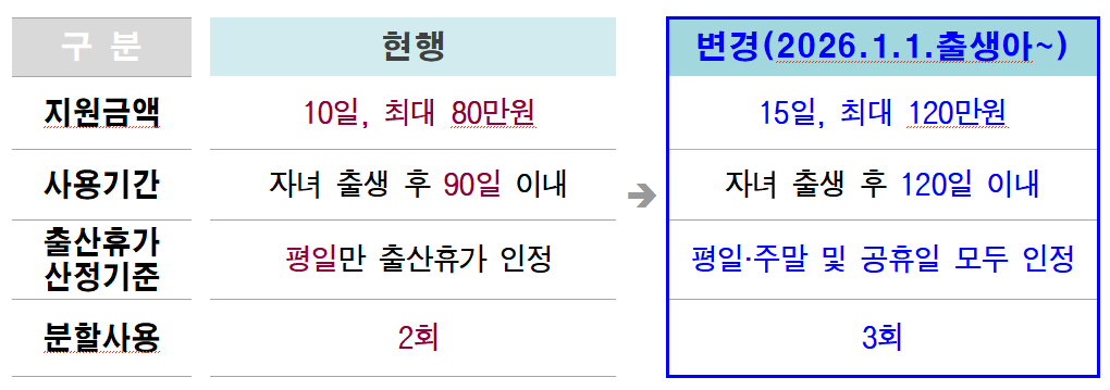 특히 자영업자와 프리랜서의 현실을 반영해 주말과 공휴일도 출산휴가 일수에 포함했다. 배송·제조·서비스업 등에서 주말 근무가 잦은 특성을 고려한 조치로, ‘제도는 있지만 쓰기 어려웠던 휴가’를 실제로 활용할 수 있도록 한 것이 특징이다.