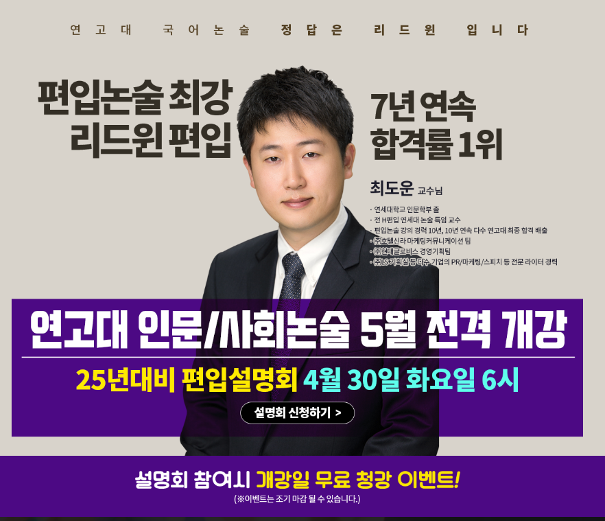 이번 설명회는 논술을 처음 접하는 학생들 그리고 타학원 재수생들이 대상이다. 연고대 편입을 목표로 하는 학생들과 내년에 도전하고자 하는 학생들에게 공부 방향을 제시할 것이다. 5월부터 시작해서 완벽하게 합격할 수 있도록 24학년 연고대 논술 경영학과 다수 합격생을 배출한 인문, 사회논술 베테랑 교수와 함께 논술 준비 방법을 알아보도록 할 예정이다. 설명회를 통해 이 분야 전문교수진 및 17년 베테랑 컨설턴트인 앤소니 임의 컨설팅도 받을 수 있다고 한다.