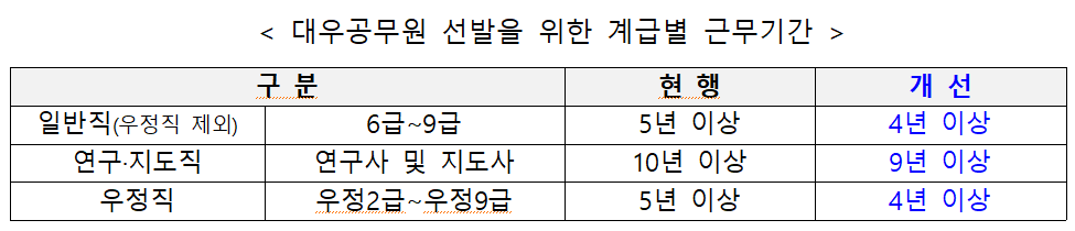6급 이하 실무직공무원의 대우공무원 선발 기간을 지금보다 1년 단축해 대우공무원 선발 및 수당 지급 시기를 앞당겨, 6급 이하 공무원의 경우 각 계급에서 4년 이상 근무하면 대우공무원으로 선발할 수 있게 된다.
