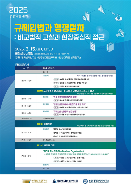 이번 학술대회는 행정입법의 투명성과 예측 가능성을 높이기 위한 개선방안을 논의하는 자리로, 국내외 행정입법 절차를 비교법적 관점에서 분석하고, 현장의 목소리를 반영한 실질적인 정책 제안을 모색하는 데 초점을 맞춘다.