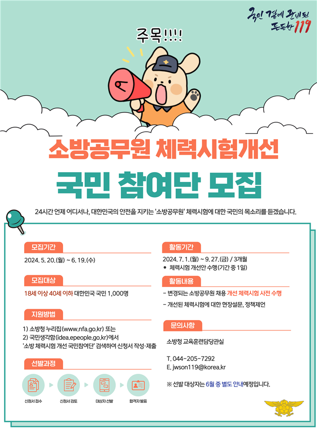 참가 자격은 만 18세 이상 40세 이하 대한민국 국민이라면 누구나 신청할 수 있으며, 공고 및 접수 방법은 소방청 누리집 또는 국민생각함에서 ‘소방 체력시험 국민참여단’을 검색하면 된다.