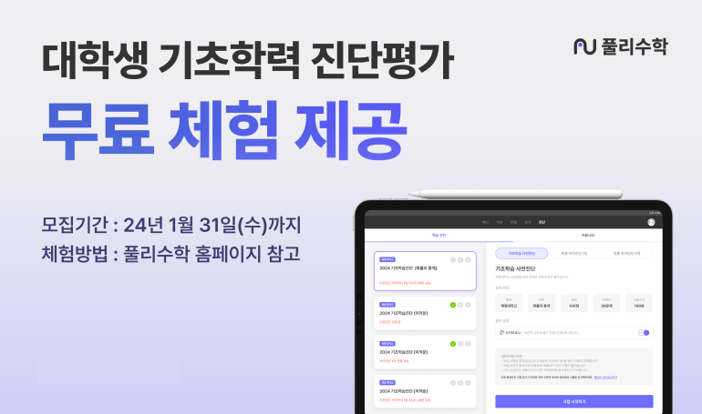 [피앤피뉴스=마성배 기자] 1등 수학 솔루션 ‘매쓰플랫’을 운영하는 (주)프리윌린(대표 권기성)은 AI 디지털 수학 학습 서비스 ‘풀리수학(Pulley)’을 통해 전국 대학을 대상으로 ‘대학생 기초학력 진단 평가’의 무료 체험 기회를 제공한다고 23일 밝혔다.