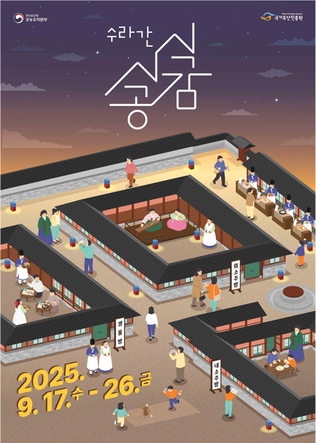 [피앤피뉴스=마성배 기자] 국가유산청 궁능유적본부(본부장 이재필)와 국가유산진흥원(원장 이귀영)이 9월 17일부터 26일까지 경복궁 소주방 권역(서울 종로구)에서 하반기 「수라간 시식공감」을 개최한다.