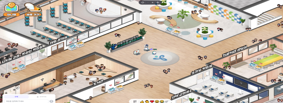 가상학교에는 고교학점제 운영을 위해 설계된 10종의 핵심 공간이 한 층에 집약적으로 구현됐다. 선택 교과실과 홈베이스를 비롯해 소규모·대형 강의실, 도서관, 진로진학 상담실, 자기주도학습실, 디지털 교실과 온라인학습실, 학습카페, 문화예술 공간 등이 배치돼 실제 학교 환경을 반영했다. 각 공간은 학생 선택 중심 교육과정 운영에 맞춰 어떤 역할을 수행하는지, 학교 현장에서 어떻게 활용되는지를 설명하는 안내창과 함께 제공된다.