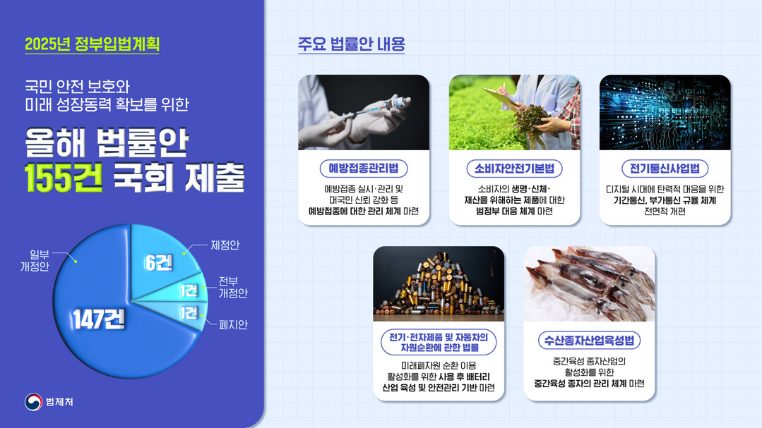 [피앤피뉴스=마성배 기자] 정부는 2025년도 입법계획을 통해 국민 안전 강화와 디지털 경제 전환에 대응하기 위한 총 155건의 법률안을 국회에 제출할 예정이다. 예방접종 체계를 제도화하는 ‘예방접종관리법’ 제정안부터 통신산업 경쟁력 강화를 목표로 한 ‘전기통신사업법’ 개정안 등 다양한 법안이 포함됐다.