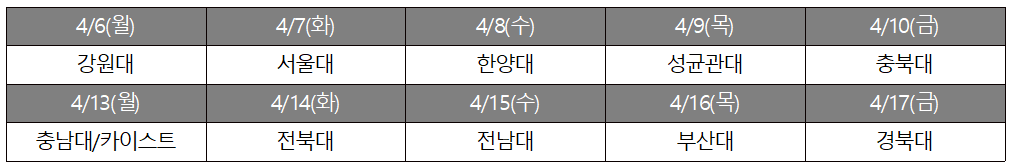 16개 지역별 밀착 설명회 병행 이번 전국 투어는 4월 6일 강원대학교를 시작으로 4월 17일까지 약 2주간 이어진다. 주요 방문 대학은 서울대(7일), 한양대(8일), 성균관대(9일), 충북대(10일)를 거쳐, 둘째 주에는 충남대·카이스트(13일), 전북대(14일), 전남대(15일), 부산대(16일), 경북대(17일) 순으로 진행될 예정이다.