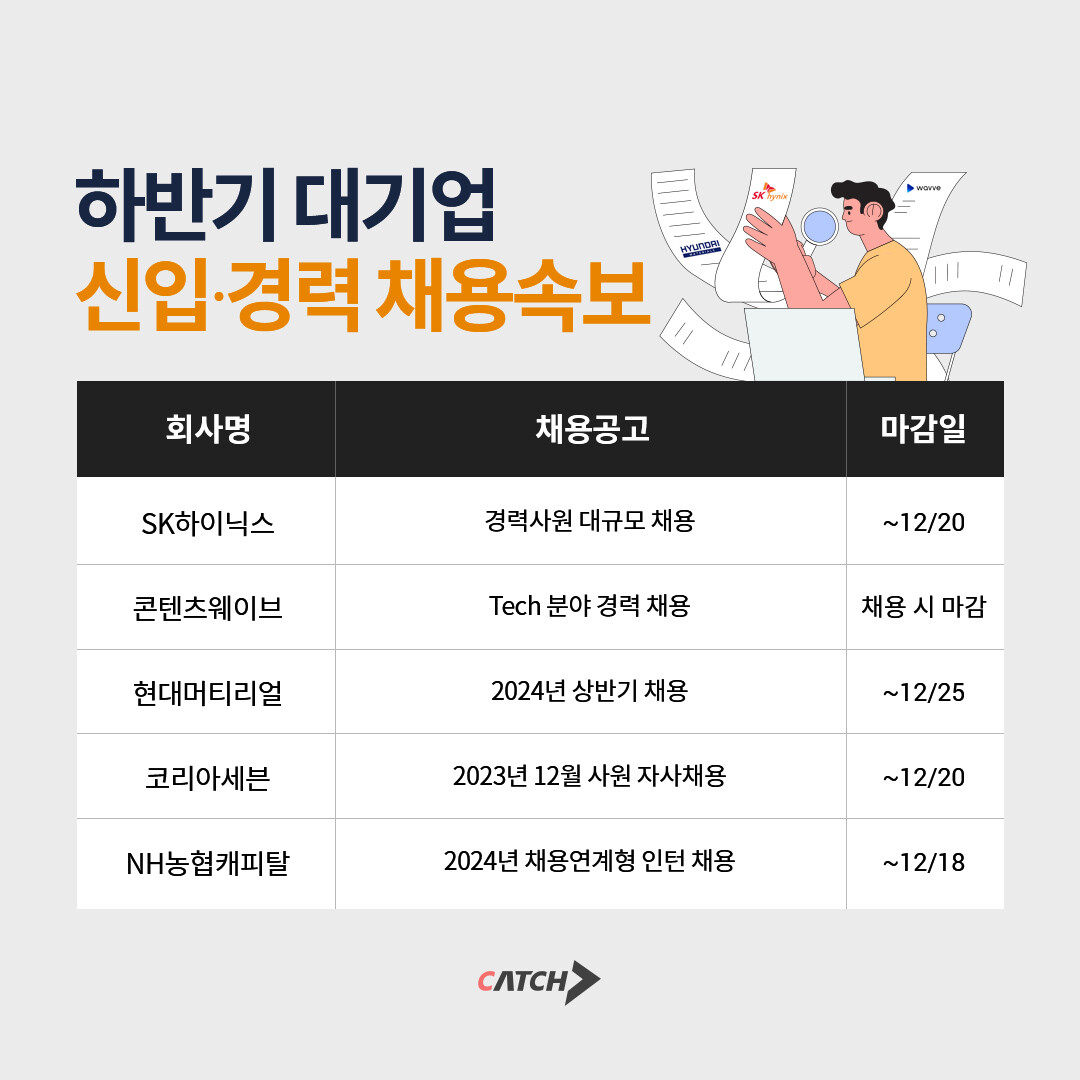 [피앤피뉴스=마성배 기자] 진학사 캐치는 15일 SK하이닉스, 콘텐츠웨이브, 현대머티리얼, 코리아세븐, NH농협캐피탈 등 신입·경력 채용이 활발하다고 밝혔다.