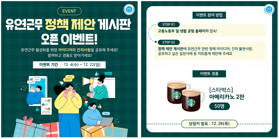 고용노동부는 관심을 유도하기 위해 12월 4일부터 22일까지 제안한 사람 중 50명을 추첨해 커피쿠폰을 증정한다. 당첨자는 12월 26일에 발표될 예정이다.