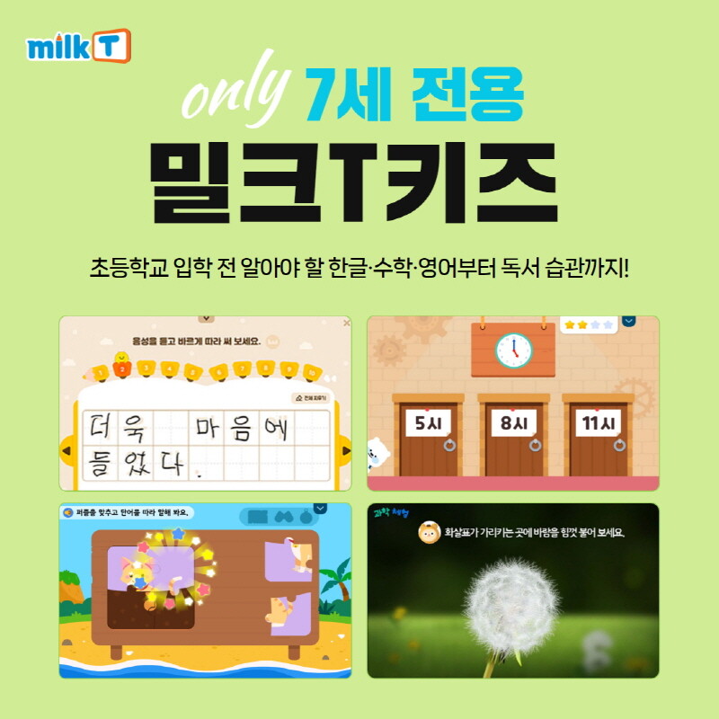 천재교과서가 만든 스마트학습지 밀크T는 초등학교 입학 전 알아야 할 한글, 수학, 영어 학습부터 독서 습관을 길러주는 동화, 창의력을 키워줄 다양한 영상을 제공하며 인기를 끌고 있다. 오직 7살 눈높이에 맞춘, 7세 전용 콘텐츠 ‘밀크T키즈’가 바로 그것이다.