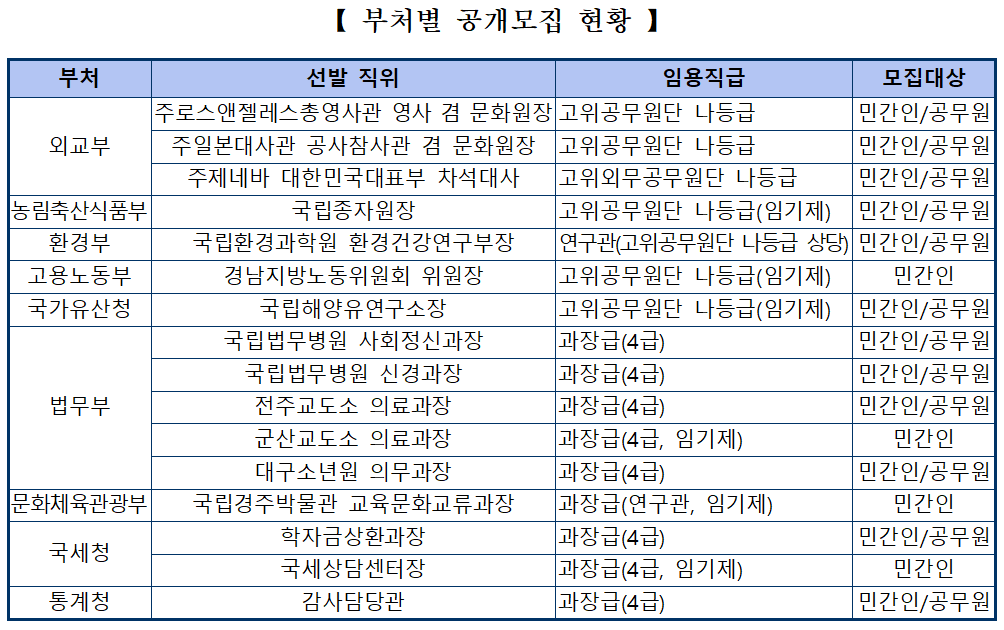 고위공무원단 직위에서는 외교부, 환경부, 농식품부 등 다양한 부처에서 7개 직위가 모집된다.