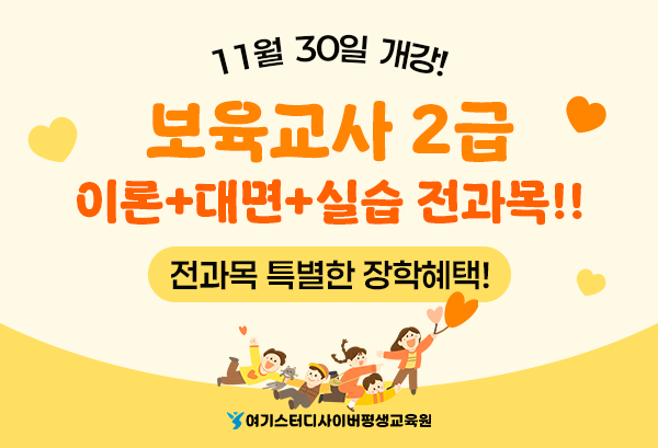 한편 여기스터디사이버평생교육원은 오는 11월 30일 개강반에 보육교사 2급 자격증 취득과정 포함 총 7개 국가자격증 과정과 학사/전문학사 학위취득 과정의 총 124과목을 개강한다. 자세한 내용은 홈페이지를 통해 확인 가능하다.