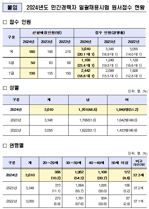 [피앤피뉴스=마성배 기자] 2024년도 국가공무원 5·7급 민간경력자 일괄채용시험 경쟁률이 20.1대 1로, 지난해에 이어 2년 연속 큰 폭으로 상승했다.