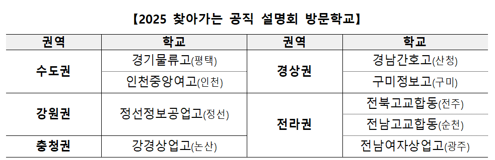 이번 설명회는 12일 강경상업고를 시작으로 19일 인천중앙여고, 25일 전남지역 특성화고교를 끝으로 올해 일정을 마무리한다.