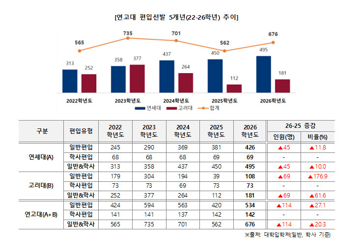 2026학년도 연세대·고려대 편입 모집정원이 확대되며, 최상위권 대학 진입의 기회가 커지고 있다. 연고대의 편입 총 선발 인원은 676명으로 전년 대비 114명 증가해 20% 이상 확대됐으며, 고려대 역시 181명을 모집하며 전년 대비 69명이 증가했다. 이는 최상위권 대학편입이 소수 정원 중심의 제한적 기회에서 벗어나, 본격적인 규모 경쟁 단계로 이동하고 있다고 평가된다.