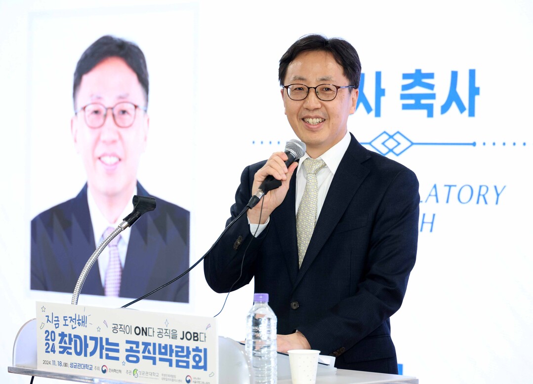 <연원정 인사혁신처장이 지난 11월 18일 '2024 찾아가는 공직박람회'가 열린 서울 종로구 성균관대학교를 방문해 축사하고 있다.>