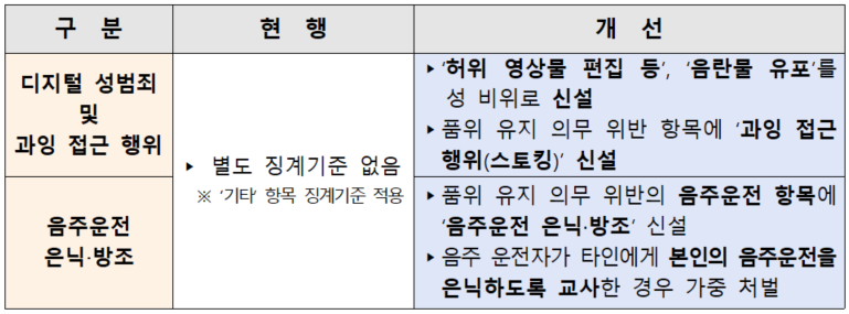 그동안 첨단 조작 기술을 활용한 성 비위, 즉 딥페이크 허위 영상물 제작·편집과 같은 행위는 성 관련 비위 항목 중 ‘기타’로 분류됐고, 음란물 유포나 과잉 접근 행위인 스토킹 역시 품위 유지 의무 위반의 ‘기타’ 항목으로 처리돼 비위의 심각성에 비해 낮은 징계기준이 적용되는 한계가 있었다.
