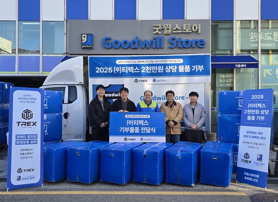 이번 기부는 ‘2025년 ㈜티렉스 굿윌스토어 기부’라는 명칭으로 12월 18일 전주시 완산구 팔달로에 위치한 굿윌스토어에서 진행됐는데, 이날 ㈜티렉스는 생활용품을 중심으로 공급가 기준 2천만 원을 상회하는 약 252개 품목, 총 1,093개의 물품을 기부해 다양한 품목을 제공함으로써 기부처에서 필요로 하는 물품을 적재적소에 전달할 수 있도록 했다.
