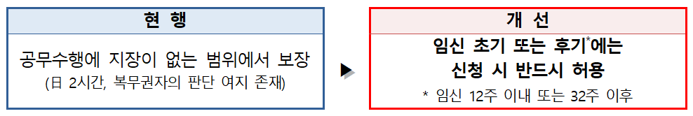 임신 여성 공무원을 위한 제도적 보호도 강화된다. 지금까지는 임신 12주 이내 또는 32주 이후에 하루 2시간 이내의 모성보호시간을 신청할 수 있었지만, 실제 사용 여부는 복무권자의 재량에 따라 제한되기도 했다. 이번 개정안은 신청만 하면 무조건 허용하도록 규정을 강화해, 임신 중인 공무원의 건강권과 휴식권을 실질적으로 보장한다.