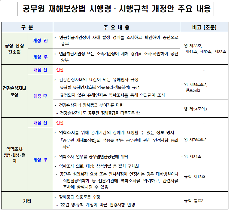임신 중 공무원이 공무 수행 중 재해를 입어 자녀가 선천성 질환을 앓게 된 경우, 자녀도 공무원 재해보상 대상에 포함된다. 이를 위해 장해등급 기준과 건강손상자녀 유해인자가 새롭게 규정됐다.