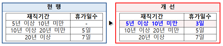 공직 사회에 새로운 에너지를 불어넣기 위해 재직 기간 5년 이상 10년 미만인 공무원을 대상으로 한 3일의 특별휴가가 신설된다. 그동안 장기재직휴가는 10년 이상 근무자에게만 주어지는 혜택이었으나, 조직 몰입도와 직무 만족도를 끌어올리기 위해 그 대상을 중간 연차까지 넓혔다.