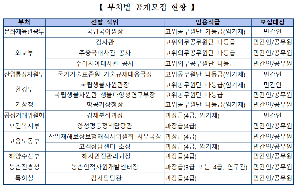 모집 대상은 11개 부처에서 고위공무원단 8개 직위와 과장급 7개 직위로, 문화체육관광부, 외교부, 산업통상자원부, 환경부, 기상청 등 다양한 기관이 포함됐다.
