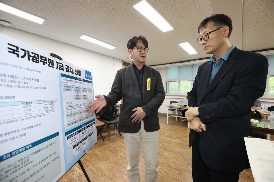 <이인호 인사혁신처 차장(오른쪽)이 지난해 7월 22일 국가공무원 7급 공개경쟁채용 제1차 시험장인 서울 강남구 개원중학교를 찾아 시험 상황을 점검하고 있다. 사진=인사혁신처 제공>