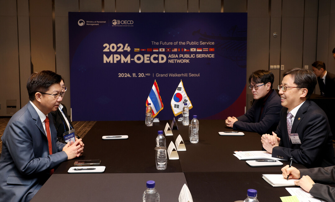 <연원정 인사혁신처장이 20일 서울 광진구 그랜드워커힐 호텔에서 열린 '2024 인사혁신처-OECD 아시아 인사행정 네트워크 컨퍼런스'에서 피야와트 시바락스 태국 인사위원회 위원장과 양자면담을 하고 있다.>