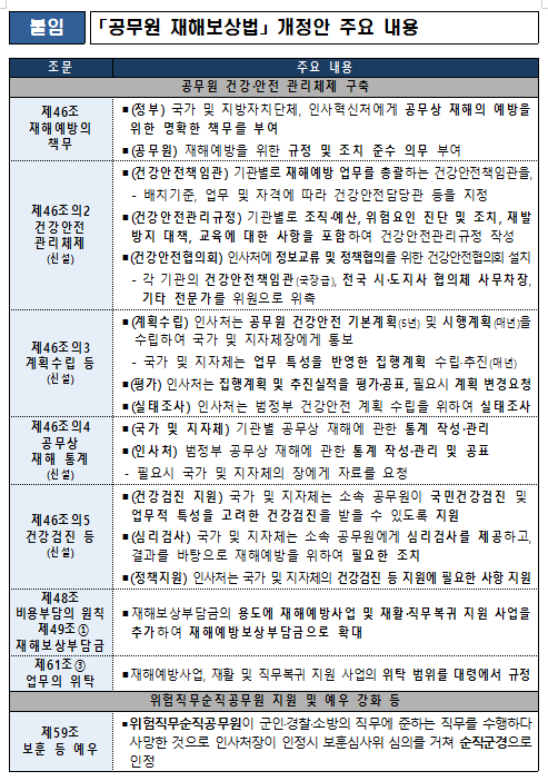 현행법은 공무원 재해예방이 임의 규정에 불과해 위험업무를 수행하는 공무원이 제대로 보호받지 못하는 경우가 있었지만, 이번 법 개정으로 공무상 재해예방에 대한 각 기관의 책임이 강화된다.
