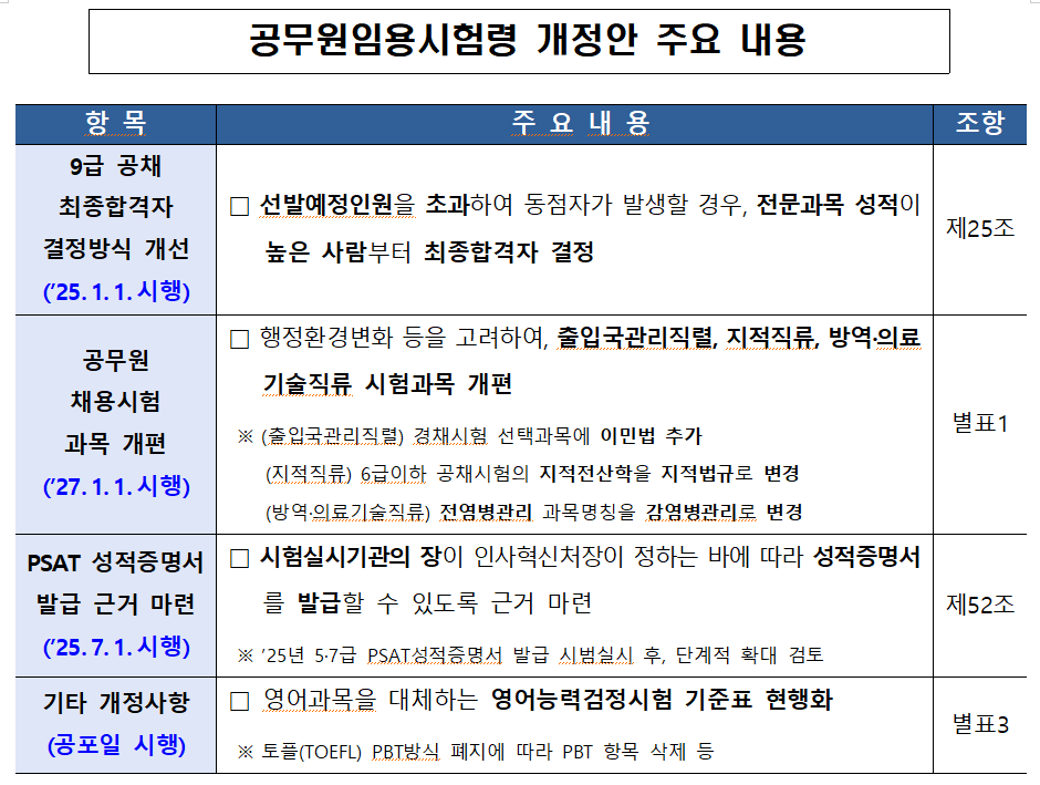 연원정 인사처장은 “이번 개정안은 공무원 시험의 직무 역량을 강화하고, 수험생들의 편의를 고려한 합리적인 제도 개선에 중점을 두었다”며 “앞으로도 우수 인재가 공직에 유입될 수 있도록 지속적인 제도 개선을 추진하겠다”고 말했다.