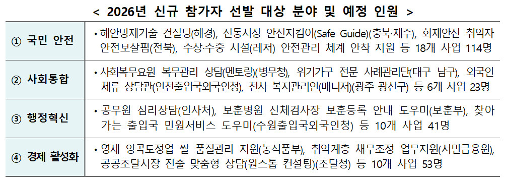 분야별로 보면 국민 안전 영역에서 가장 많은 인원이 배치된다. 해안방제기술 컨설팅과 전통시장 안전 점검, 화재 취약계층 관리, 수상·수중 레저시설 안전관리 체계 구축 지원 등 18개 사업에 114명이 참여한다. 현장 점검과 사고 예방 중심 활동을 통해 지역 안전 관리 기능을 보완하는 역할을 맡는다.