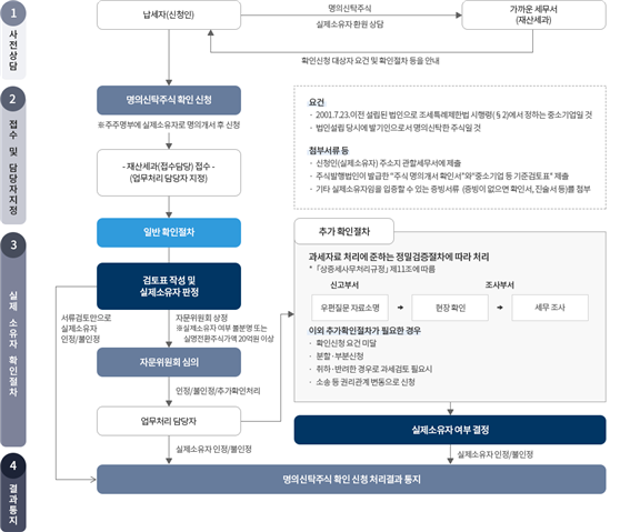2001년 7월 23일 이전에는 상법 규정에 따라 발기인이 3명 이상일 경우에만 법인 설립이 허용되어 부득이하게 다른 사람을 주주로 등재하는 명의신탁 사례가 많았다. 이처럼 명의신탁한 주식을 실제 소유자에게 환원하는 경우 관련 증빙을 제대로 갖추지 못해 이를 입증하는 데 많은 불편과 어려움을 겪고 있다. 이러한 사정을 고려하여 일정한 요건을 갖추면 세무조사 등 종전의 복잡하고 까다로운 확인 절차 없이 통일된 기준에 따라 납세자가 제출한 증빙서류와 국세청 내부 자료 등을 활용하여 간소화된 절차에 따라 실제 소유자를 확인해 줌으로써 납세자의 입증 부담을 덜어주고 원활한 가업승계와 안정적인 기업경영 및 성장을 지원하기 위해 마련한 제도이다.