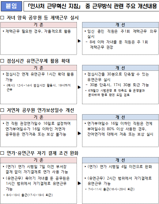 연원정 인사처장은 “공직사회가 보다 유연하고 효율적으로 일하면서도 성과를 내는 조직으로 변화할 수 있도록, 광범위한 의견 수렴을 거쳐 근무 혁신 지침을 마련했다”고 밝혔다.