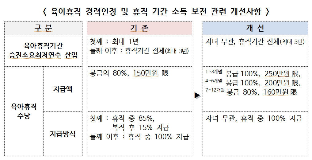 이번 계획의 핵심은 육아휴직 제도의 전면 개선이다. 앞으로는 첫째 자녀에 한정하지 않고, 모든 자녀에 대해 육아휴직 전 기간을 승진을 위한 경력으로 인정한다. 또한, 육아휴직 수당을 휴직 기간 내내 100% 지급해 경제적 부담을 완화할 방침이다.
