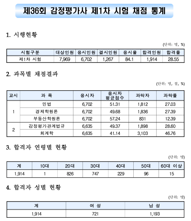 올해 1차 시험은 지난 4월 5일 전국 5개 지역(서울, 부산, 대구, 광주, 대전) 18개 시험장에서 동시에 치러졌으며, 총 지원자는 7,969명, 이 중 결시자를 제외한 실질 응시자는 6,702명이었다. 한국산업인력공단은 5월 8일 오전 9시를 기점으로 큐넷 감정평가사 홈페이지를 통해 합격자 명단과 성적을 공개했다.
