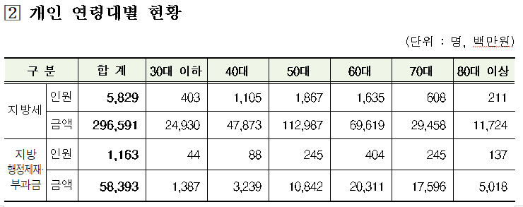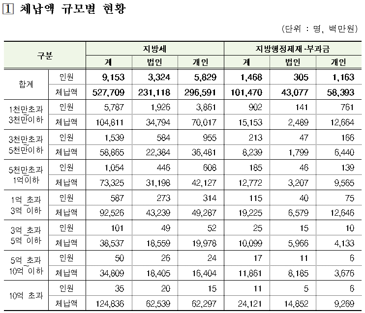 지방세 체납자의 경우 서울 1,804명, 경기 2,816명 등 수도권이 전체의 절반 이상(50.5%)을 차지했으며, 지방소득세·취득세 등이 주요 체납 세목으로 나타났다.