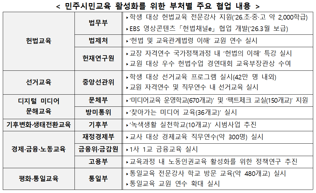우선 학교 현장의 헌법교육이 대폭 강화된다. 학생들이 헌법의 기본 원리와 가치를 이해하고 삶 속에서 실천할 수 있도록 법무부·법제처·헌법재판연구원과 협력해 헌법교육 전문강사 지원을 확대하고, 초·중학교 중심이던 프로그램을 고등학교까지 넓혀 약 2,000학급을 대상으로 운영한다. 교장 자격연수와 시도별 교원연수 과정에도 헌법교육이 포함된다.