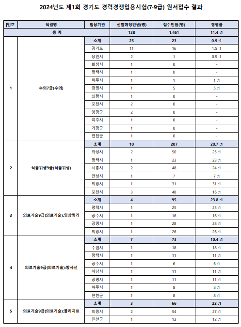 (접수율)2024년도 제1회 경기도 경력경쟁입용시험(7·9급) 원서접수 현황을 붙임과 같이 안내합니다.
