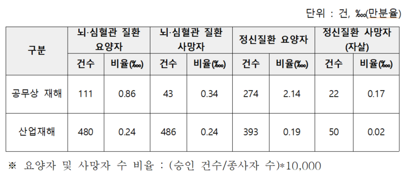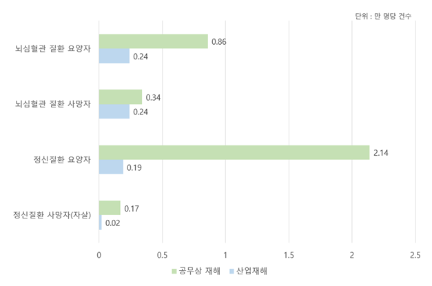 이는 1만 명당 요양자 수를 기준으로 산업재해와 비교했을 때, 업무상 정신질환으로 인한 요양자는 약 11배, 업무상 뇌·심혈관 질환으로 인한 요양자는 약 3.6배나 많은 수준이다.