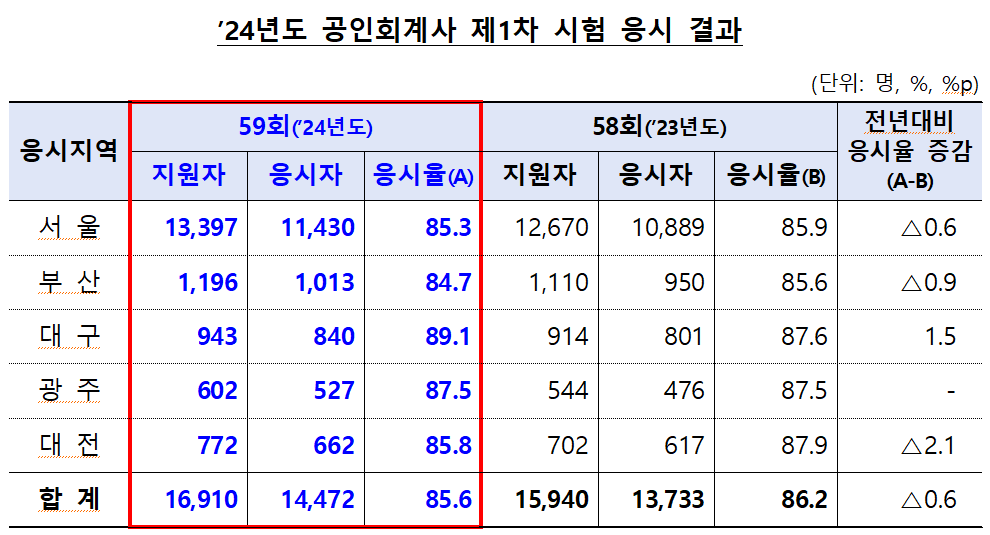 26일 금융감독원 발표에 따르면, 공인회계사 1차 지원자 16,910명 중 응시자는 총 14,472명으로 지난해(13,733명) 대비 739명(5.4%) 늘었으나 응시율은 0.6%p 하락한 85.6%로 잠정 집계됐다.